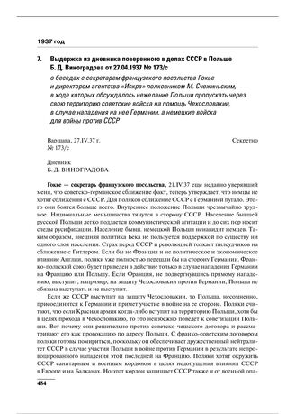 Выдержка из дневника поверенного в делах СССР в Польше Б.Д. Виноградова от 27.04.1937 № 173/с о беседах с секретарем французского посольства Гокье и директором агентства «Искра» полковником М. Счежиньским, в ходе которых обсуждалось нежелание Польши пропускать через свою территорию советские войска на помощь Чехословакии, в случае нападения на нее Германии, а немецкие войска для войны против СССР // АВП. Ф. 05. Оп. 17. П. 133. Д. 81. Л. 107–108.