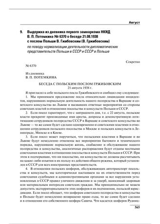 Выдержка из дневника первого замнаркома НКИД В.П. Потемкина № 6370 о беседе 21.08.1938 с послом Польши В. Гжибовским (В. Гржибовским) по поводу нормализации деятельности дипломатических представительств Польши в СССР и СССР в Польше // АВП. Ф. 011. Оп. 2. П. 20. Д. 206. Л. 307–310.