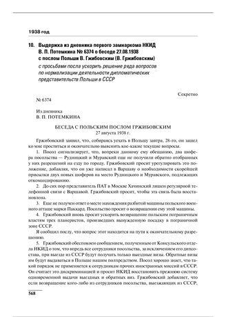 Выдержка из дневника первого замнаркома НКИД В.П. Потемкина № 6374 о беседе 27.08.1938 с послом Польши В. Гжибовским (В. Гржибовским) с просьбами посла ускорить решение ряда вопросов по нормализации деятельности дипломатических представительств Польши в СССР // АВП. Ф. 011. Оп. 2. П. 20. Д. 206. Л. 313–314.