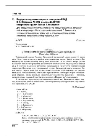 Выдержка из дневника первого замнаркома НКИД В.П. Потемкина № 6452 о вызове 23.09.1938 поверенного в делах Польши Т. Янковского для передачи советского заявления по поводу скопления польских войск на границе с Чехословакией и заявлениях Т. Янковского, что никакого скопления войск нет, и его готовности передать советское заявление своему правительству // АВП. Ф. 011. Оп. 2. П. 20. Д. 207. Л. 47. Документы и материалы по истории советско-польских отношений. Т. VI. М., 1969. С. 516–517; ДВП СССР. Т. XXI. М., 1977. С. 516–517.