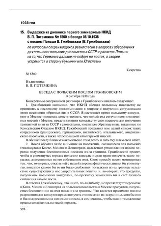 Выдержка из дневника первого замнаркома НКИД В.П. Потемкина № 6500 о беседе 08.10.1938 с послом Польши В. Гжибовским (В. Гржибовским) по вопросам сохраняющихся разногласий в вопросах обеспечения деятельности польских дипломатов в СССР и расчетов Польши на то, что Германия дальше не пойдет на восток, а скорее устремится в сторону Румынии или Югославии // АВП. Ф. 011. Оп. 2. П. 20. Д. 207. Л. 77–79.