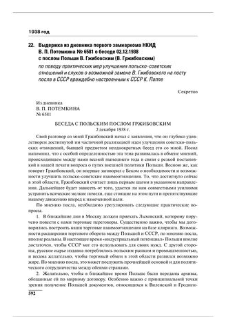Выдержка из дневника первого замнаркома НКИД В.П. Потемкина № 6581 о беседе 02.12.1938 с послом Польши В. Гжибовским (В. Гржибовским) по поводу практических мер улучшения польско-советских отношений и слухов о возможной замене В. Гжибовского на посту посла в СССР враждебно настроенным к СССР К. Паппе // АВП. Ф. 011. Оп. 2. П. 20. Д. 207. Л. 135–141.