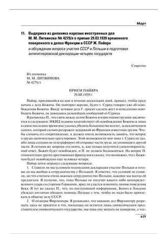 Выдержка из дневника наркома иностранных дел М.М. Литвинова № 4279/л о приеме 29.03.1939 временного поверенного в делах Франции в СССР Ж. Пайяра и обсуждении вопроса участия СССР и Польши в подготовке антигитлеровской декларации четырех государств