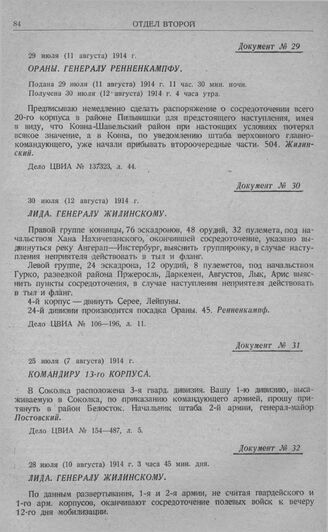 Изменения в планах сосредоточения 1-й и 2-й армий. Лида. Генералу Жилинскому. 30 июля (12 августа) 1914 г. // Дело ЦВИА № 106—196, л. 11.