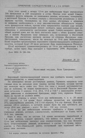 Изменения в планах сосредоточения 1-й и 2-й армий. Начальник штаба Верховного главнокомандующего. 28 июля (10 августа) 1914 г. // Дело ЦВИА № 140—908, лл. 68—65.