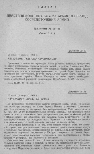 Действия конницы 1-й и 2-й армий в период сосредоточения армий. Нескучное. Генералу Орановскому. 25 июля (1 августа) 1914 г. // Дело ЦВИА № 14—565, лл. 3—4.