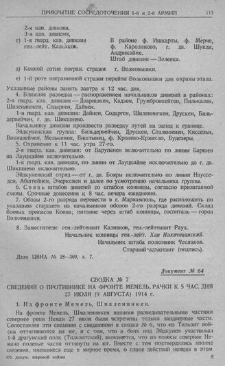 Действия конницы 1-й и 2-й армий в период сосредоточения армий. Сводка № 7 сведений о противнике на фронте Мемель, Рачки к 5 час. дня 27 июля (9 августа) 1914 г.