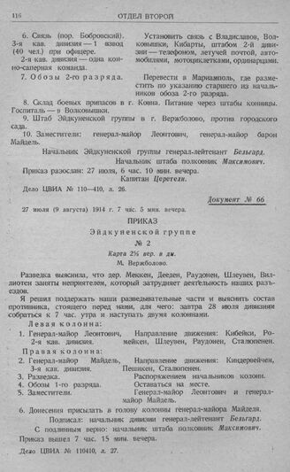 Действия конницы 1-й и 2-й армий в период сосредоточения армий. Приказ Эйдкуненской группе № 2. Вержболово.27 июля (9 августа) 1914 г. 7 час. 5 мин. вечера // Дело ЦВИА № 110410, л. 27.
