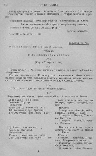 Развертывание 2-й армии и занятие ею исходного положения для наступления. Приказ 15-му армейскому корпусу. № 3. 31 июля (13 августа) 1914 г. 2 часа 30 мин. дня // Дело ЦВИА № 3861, лл. 158—159.