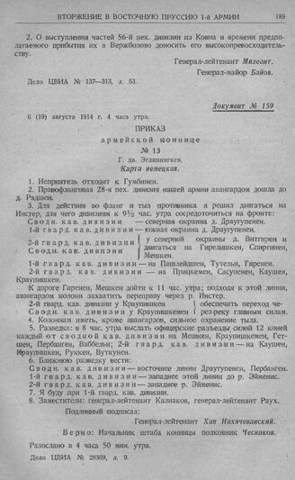 Гумбинен-Гольдапское сражение 1-й армии. Приказ армейской коннице. № 13. Эглинингкен. 6 (19) августа 1914 г. 4 часа утра // Дело ЦВИА № 28369, л. 9.
