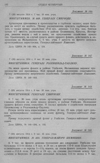 Гумбинен-Гольдапское сражение 1-й армии. Мингштиммен. Генералу Смирнову. 7 (20) августа 1914 г. 8 час. 35 мин. утра // Дело ЦВИА, № 140—294, л. 155.