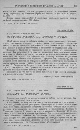 Гумбинен-Гольдапское сражение 1-й армии. Командиру 3-го армейского корпуса. 8 (21) августа 1914 г. 3 часа 15 мин. ночи // Дело ЦВИА № 137—304, л. 28.