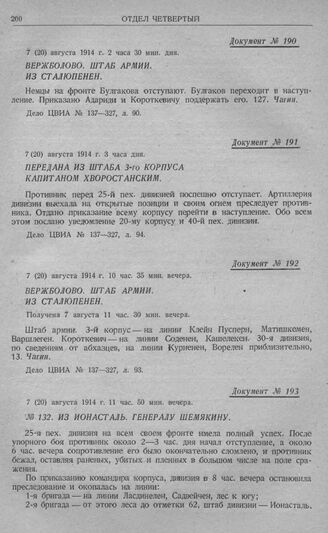 Гумбинен-Гольдапское сражение 1-й армии. Вержболово. Штаб армии. Из Сталюпенен. 7 (20) августа 1914 г. 10 час. 35 мин. вечера // Дело ЦВИА № 137—327, л. 93.
