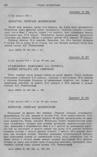Гумбинен-Гольдапское сражение 1-й армии. Сталюпенен. Командиру 3-го корпуса, копию передать ген. Смирнову. 8 (21) августа 1914 г. 12 час. 08 мин. дня // Дело ЦВИА № 140—924, л. 198.
