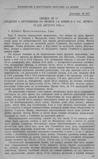 Наступление 1-й армии в направлении на Кенигсберг. Сводка № 17 сведений о противнике на фронте 1-й армии к 6 час. вечера 10 (23) августа 1914 г.