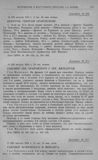 Действия 1-й армии с 16(19) по 19 августа (1 сентября), обложение крепости Кенигсберг. Белосток. Генералу Орановскому. 16 (29) августа 1914 г. 8 час. 45 мин. вечера // Дело ЦВИА № 106—196, лл. 341—343.