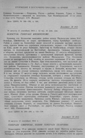 Действия 1-й армии с 16(19) по 19 августа (1 сентября), обложение крепости Кенигсберг. Генералу Смирнову, копия генералу Епанчину. 19 августа (1 сентября) 1914 г. // Дело ЦВИА № 137—315, л. 237.