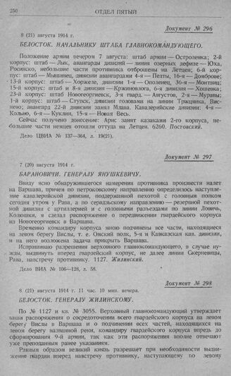 Вторжение 2-й армии в Восточную Пруссию и выход на линию Ортельсбург, Виленберг, Нейденбург, Сольдау. Белосток. Начальнику штаба главнокомандующего. 8 (21) августа 1914 г. // Дело ЦВИА № 137—364, л. 19(21).