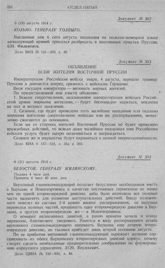 Вторжение 2-й армии в Восточную Пруссию и выход на линию Ортельсбург, Виленберг, Нейденбург, Сольдау. Кольно. Генералу Толпыго. 6 (19) августа 1914 г. // Дело ВИА № 141—569, л. 40.