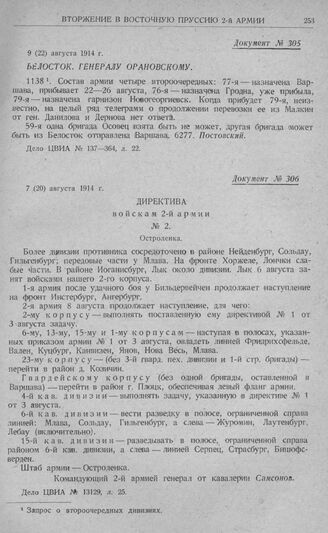 Вторжение 2-й армии в Восточную Пруссию и выход на линию Ортельсбург, Виленберг, Нейденбург, Сольдау. Директива войскам 2-й армии. № 2. Остроленка. 7 (20) августа 1914 г. // Дело ЦВИА № 13129, л. 25.