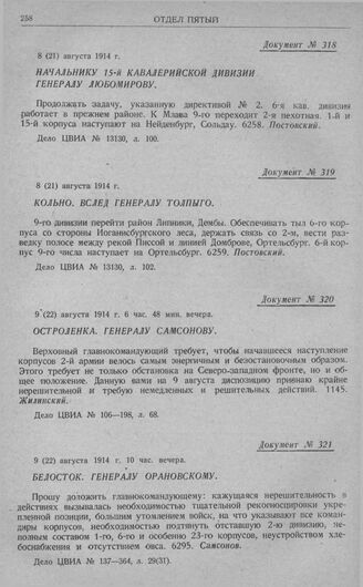 Вторжение 2-й армии в Восточную Пруссию и выход на линию Ортельсбург, Виленберг, Нейденбург, Сольдау. Остроленка. Генералу Самсонову. 9 (22) августа 1914 г. 6 час. 48 мин. вечера // Дело ЦВИА № 106—198, л. 68.