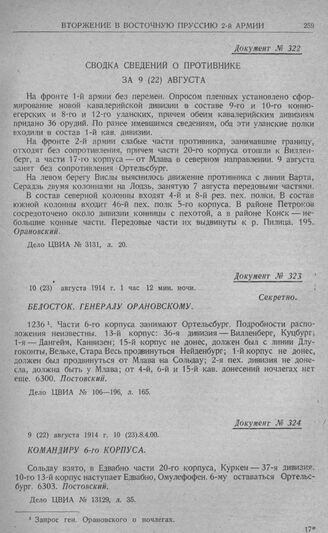 Вторжение 2-й армии в Восточную Пруссию и выход на линию Ортельсбург, Виленберг, Нейденбург, Сольдау. Сводка сведений о противнике за 9 (22) августа // Дело ЦВИА № 3131, л. 20.