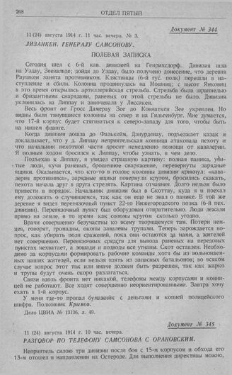 Наступление 2-й армии на фронт Зенсбург, Алленштейн и бой у Орлау, Франкенау. Разговор по телефону Самсонова с Орановским. 11 (24) августа 1914 г. 10 час. вечера // Дело ВИА № 106—198, л. 73.