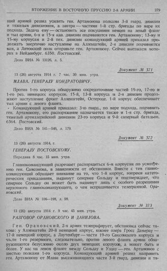 Наступление 2-й армии на фронт Алленштейн, Остероде и бои на флангах у Бишофсбург (6-й корпус) и Уздау (1-й корпус). Млава. Генералу Кондратовичу. 13 (26) августа 1914 г. 7 час. 30 мин. утра // Дело ВИА № 141—546, л. 179.