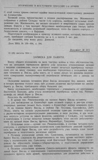 Наступление 2-й армии на фронт Алленштейн, Остероде и бои на флангах у Бишофсбург (6-й корпус) и Уздау (1-й корпус). Записка для памяти. 13 (26) августа 1914 г. // Дело ЦВИА № 140—908, лл. 275—276.
