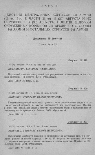 Действия центральных корпусов 2-й армии (13-го, 15-го и части 23-го). Мышинец. Генералу Благовещенскому. 16 (29) августа 1914 г. 9 час. 3 мин. вечера // Дело ВИА № 13123, л. 16.