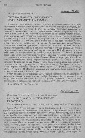 Действия центральных корпусов 2-й армии (13-го, 15-го и части 23-го). Генерал-адъютанту Ренненкампфу. Копия командиру 4-го корпуса. 19 августа (1 сентября) 1914 г. // Дело ЦВИА № 137—339, л. 317.