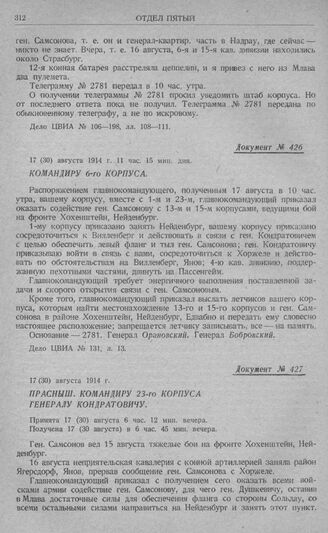 Действия центральных корпусов 2-й армии (13-го, 15-го и части 23-го). Прасныш. Командиру 23-го корпуса генералу Кондратовичу. 17 (30) августа 1914 г. // Дело ЦВИА № 140—929, л. 56—59.