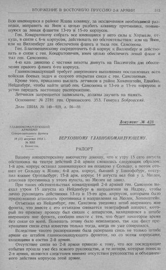 Действия центральных корпусов 2-й армии (13-го, 15-го и части 23-го). Верховному Главнокомандующему. Рапорт. 18 (31) августа 1914 г. // Дело ЦВИА № 709, лл. 113—116.