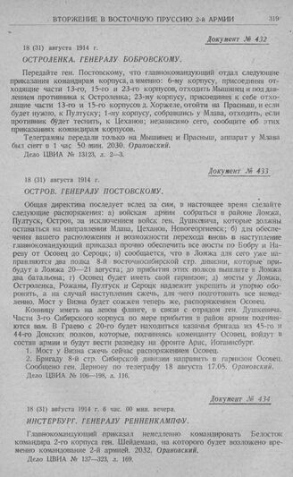 Действия центральных корпусов 2-й армии (13-го, 15-го и части 23-го). Остров. Генералу Постовскому. 18 (31) августа 1914 г. // Дело ЦВИА № 106—198, л. 116.
