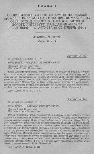 Оборонительный бой 1-й армии на рубеже рр, Алле, Омет, Ангерап и на линии Мазурских озер. Отход левого фланга к железной дороге Ангербург, Гольдап. Инстербург. Генералу Ренненкампфу. 26 августа (8 сентября) 1914 г. [1] // Дело ЦВИА № 137323, л. 230.