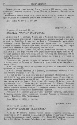 Оборонительный бой 1-й армии на рубеже рр, Алле, Омет, Ангерап и на линии Мазурских озер. Отход левого фланга к железной дороге Ангербург, Гольдап. Белосток. Генералу Жилинскому. 26 августа (8 сентября) 1914 г. [2] // Дело ЦВИА № 137562, л. 126-130.