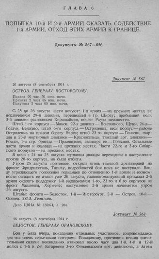 Попытка 10-й и 2-й армий оказать содействие 1-й армии и отход этих армий к границе. Остров. Генералу Постовскому. 26 августа (8 сентября) 1914 г. // Дело ЦВИА № 138874, л. 204.