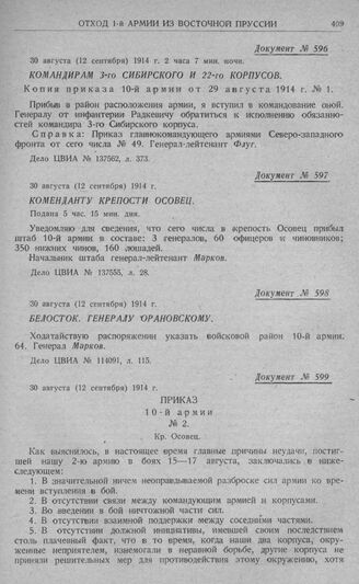 Попытка 10-й и 2-й армий оказать содействие 1-й армии и отход этих армий к границе. Приказ 10-й армии № 2. Осовец. 30 августа (12 сентября) 1914 г. // Дело ЦВИА № 114091, л. 248.