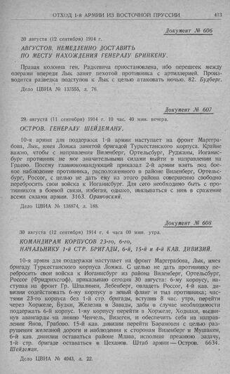 Попытка 10-й и 2-й армий оказать содействие 1-й армии и отход этих армий к границе. Августов. Немедленно доставить по месту нахождения генералу Бринкену. 30 августа (12 сентября) 1914 г. // Дело ЦВИА № 137555, л. 76.