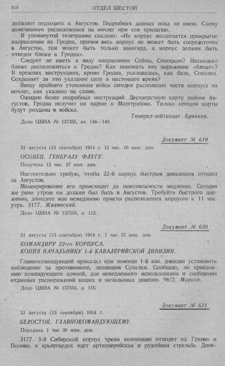 Попытка 10-й и 2-й армий оказать содействие 1-й армии и отход этих армий к границе. Осовец. Генералу Флугу. 31 августа (13 сентября) 1914 г. 12 час. 10 мин. дня // Дело ЦВИА № 137555, л. 112.