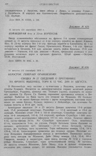 Попытка 10-й и 2-й армий оказать содействие 1-й армии и отход этих армий к границе. Белосток. Генералу Орановскому. Сводка № 27 сведений о противнике на фронте Мышинец, Торн к 12 час. дня 31 августа. 31 августа (13 сентября) 1914 г. // Дело ЦВИА № 137363, л. 71.