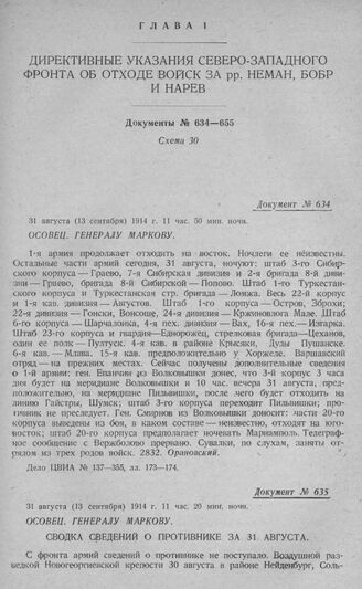 Директивные указания Северо-западного фронта об отходе войск за рр. Неман, Бобр и Нарев. Осовец. Генералу Маркову. 31 августа (13 сентября) 1914 г. 11 час. 50 мин. ночи // Дело ЦВИА № 137—355, лл. 173—174.
