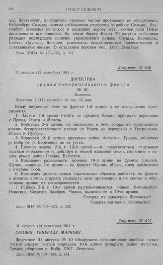 Директивные указания Северо-западного фронта об отходе войск за рр. Неман, Бобр и Нарев. Директива армиям Северо-западного фронта. № 10. Белосток. 31 августа (13 сентября) 1914 г. // Дело ВИА № 137—323, л. 242.