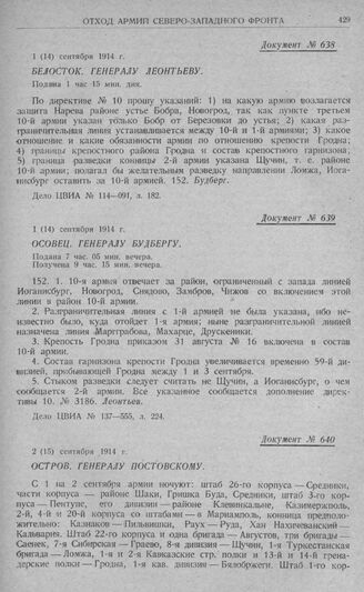 Директивные указания Северо-западного фронта об отходе войск за рр. Неман, Бобр и Нарев. Осовец. Генералу Будбергу. 1 (14) сентября 1914 г. // Дело ЦВИА № 137—555, л. 224.