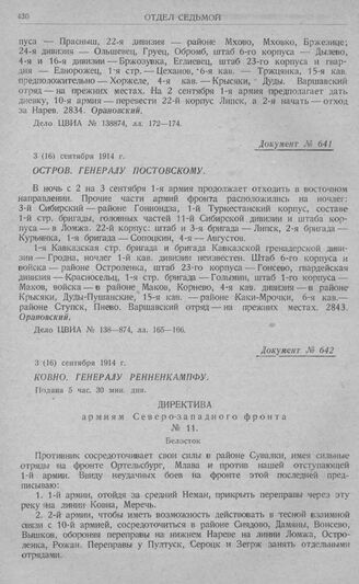 Директивные указания Северо-западного фронта об отходе войск за рр. Неман, Бобр и Нарев. Ковно. Генералу Ренненкампфу. Директива армиям Северо-западного фронта № 11. Белосток. 3 (16) сентября 1914 г. // Дело ЦВИА № 137—323, л. 280.