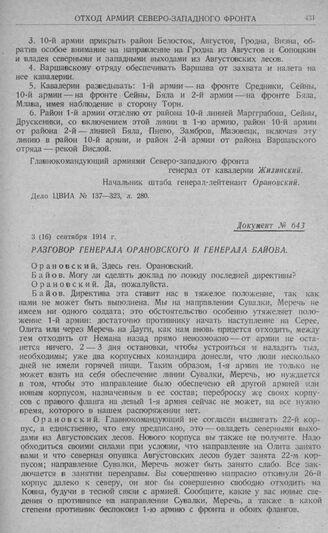 Директивные указания Северо-западного фронта об отходе войск за рр. Неман, Бобр и Нарев. Разговор генерала Орановского и генерала Байова. 3 (16) сентября 1914 г.