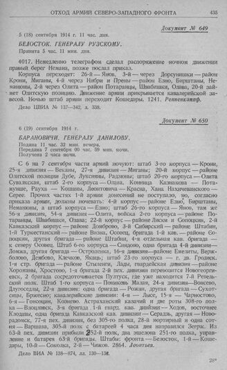 Директивные указания Северо-западного фронта об отходе войск за рр. Неман, Бобр и Нарев. Барановичи. Генералу Данилову. 6 (19) сентября 1914 г. // Дело ВИА № 138—874, лл. 130—138.