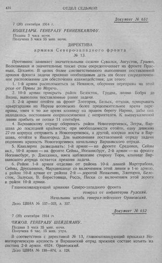 Директивные указания Северо-западного фронта об отходе войск за рр. Неман, Бобр и Нарев. Кошедары. Генералу Ренненкампфу. Директива армиям Северо-западного фронта № 13. 7 (20) сентября 1914 г. // Дело ЦВИА № 137—323, л. 327.