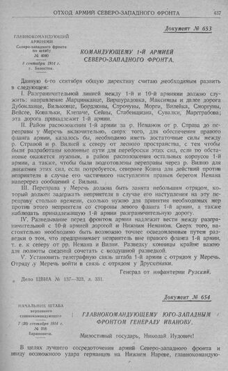 Директивные указания Северо-западного фронта об отходе войск за рр. Неман, Бобр и Нарев. Командующему 1-й армией Северо-западного фронта. Белосток. 8 сентября 1914 г. // Дело ЦВИА № 137—323, л. 331.