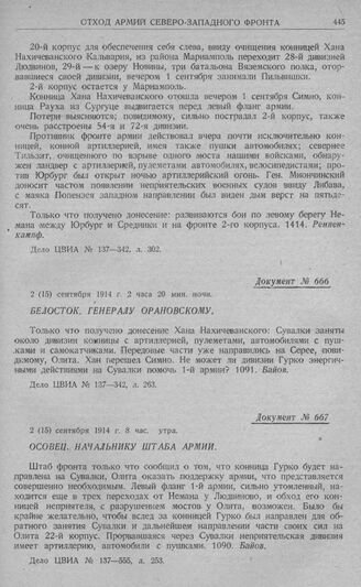 Отход 1-й армии за р. Неман. Осовец. Начальнику Штаба армии. 2 (15) сентября 1914 г. 8 час. утра // Дело ЦВИА № 137—555, л. 253.